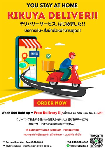 ถ้าแดดจะร้อนเบอร์นี้ ลูกค้าไม่ต้องออกมาส่งผ้าเองค่ะ กริ้งเดียวเท่านั้น คิคูยะจะไปถึงหน้าบ้านคุณ!!